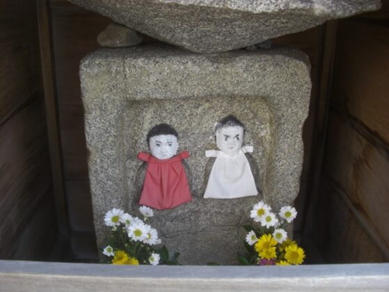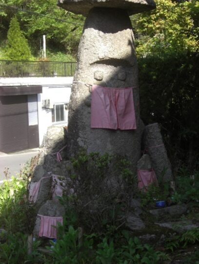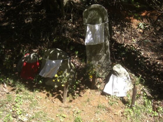 右に笠をかぶった 石仏と小さな石仏が沢山