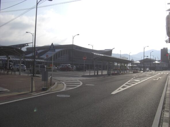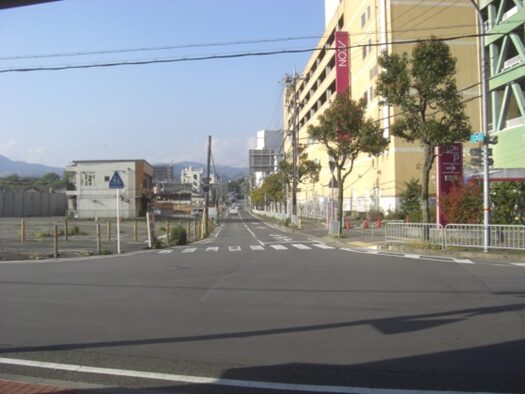 駅前から南の道、正面が 亀山城址 駅前の交差点、清阪街道の起点