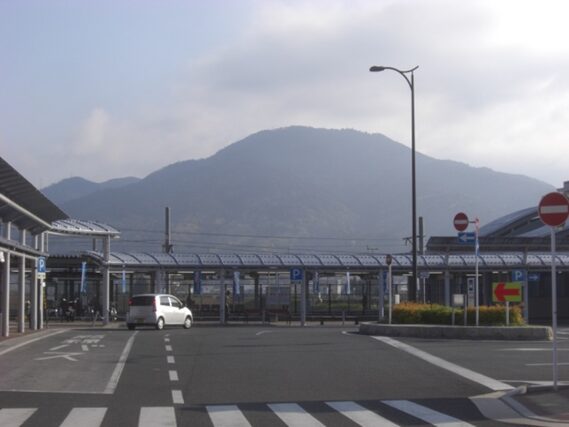 駅前から北側を見ると、愛宕山が雄大に聳える