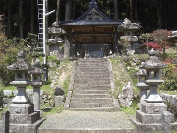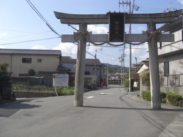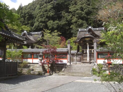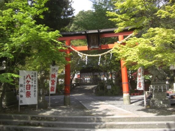 和銅2年(709)創建と伝えられる古社で、亀岡盆地が湖だった頃、大国主命が、鍬で峡を切り開き農地にされたという国造りの伝説がある。開削に使った鍬が山積みにされたことから鍬山大明神と呼ばれた