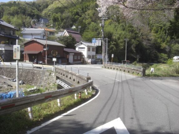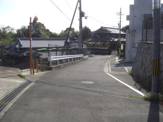 勝尾寺川に架かる中河原橋から旧亀岡街道・清阪街道を振り返る。向かって右が旧道で出てきたところ