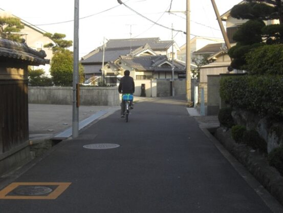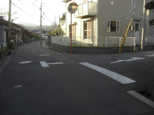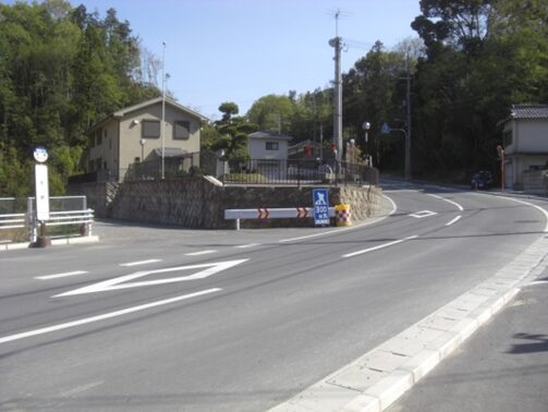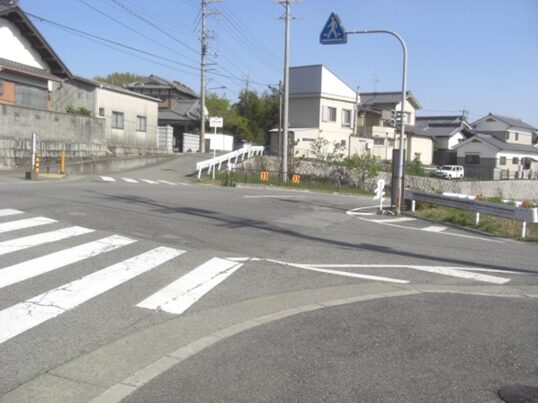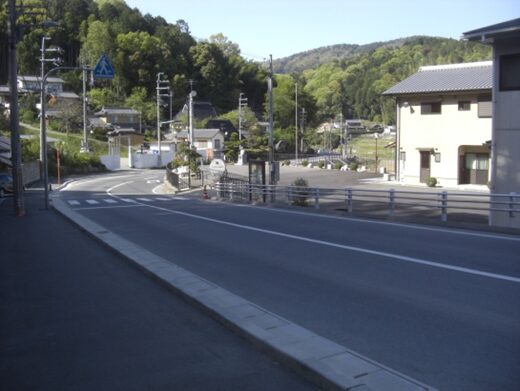 東福井3丁目で 亀岡街道 が正面(南)から来て正面右へ分岐する福井の辻