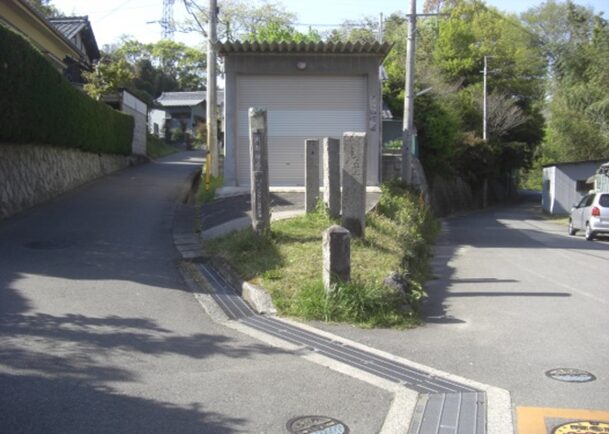 向って右の旧道を歩いてきた辻を見る、数本の 石柱 が立つ。