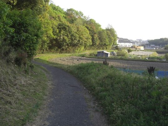 少し先で道が分岐しているので、右へ進み橋を渡り西へ。暫く進むと左への道は、枚方・高槻へ鍬山神社から道は緩やかな上り道である