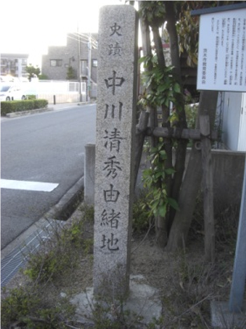 茨木市城内では唯一最大の合戦となった元亀2年(1571)の白井河原の戦いで武勲をたて、戦国大名として四万四百石の所領をもつ茨木城主となった中川清秀が生まれた由緒地(城州生誕説あり)でもあります。