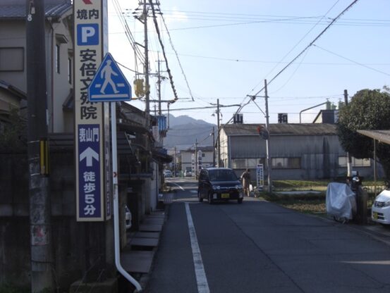 近鉄桜井駅 南口正面を50m程南に進んだ、磐余の道・岡街道起点のところの信号を右に折れ、右に線路を見ながら200m程進むと右に踏切があり、そこを左に折れる