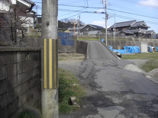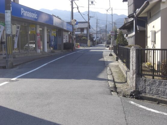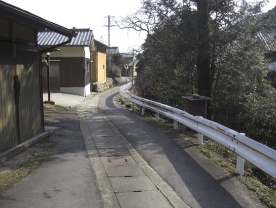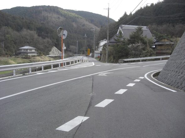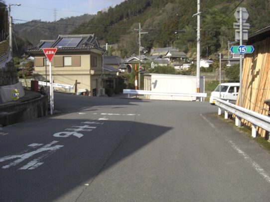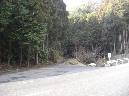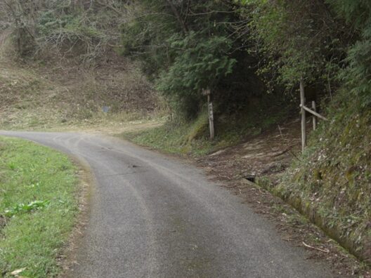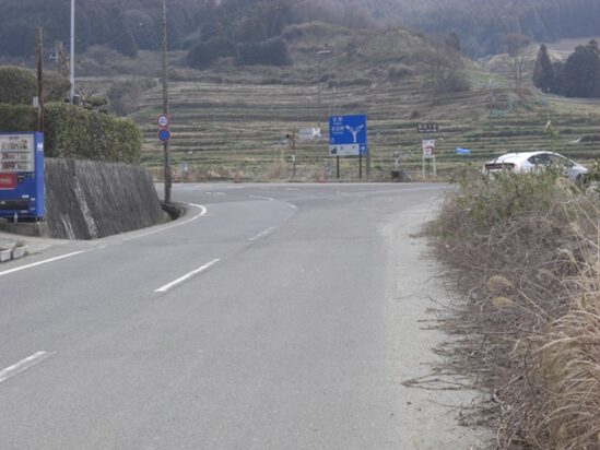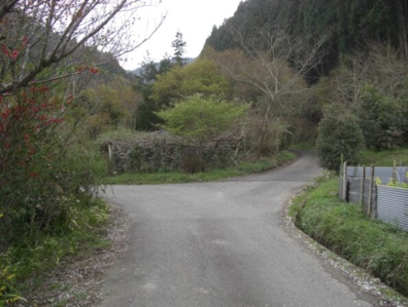 県道は右に緩やかに曲がるが、旧道は左に折れます