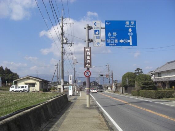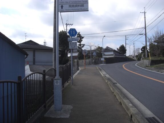 県道15号に出て暫く歩き、左手に奈良県銘木協同組合、その先、飛鳥に向かって進みます。県道15号、歩道も広く歩きやすい