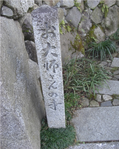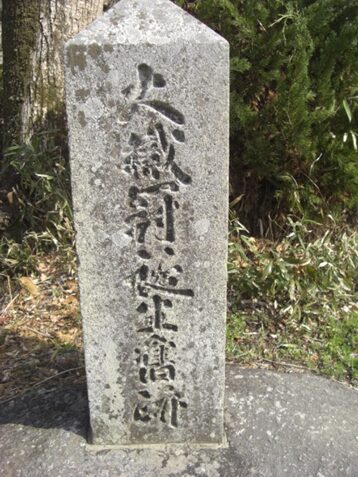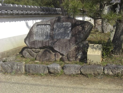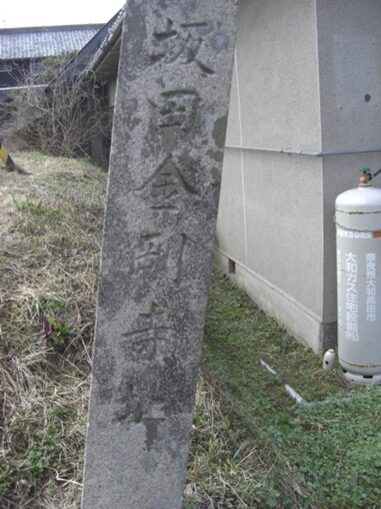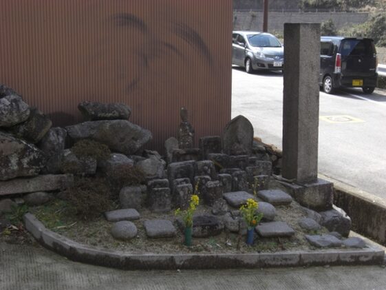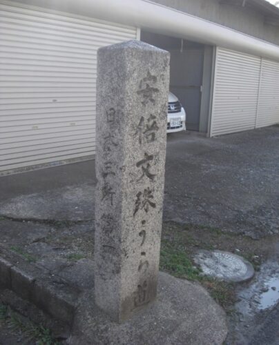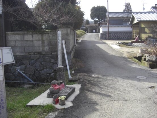街道に戻り進むと、文殊院裏入り口も街道を挟んだ向かい側の角の立つ 道標 民家の塀に組み込まれている