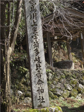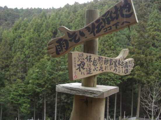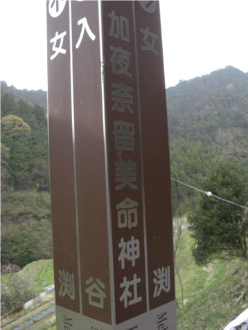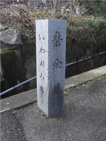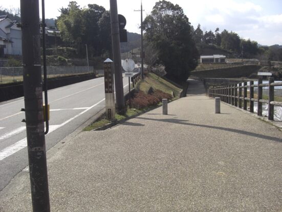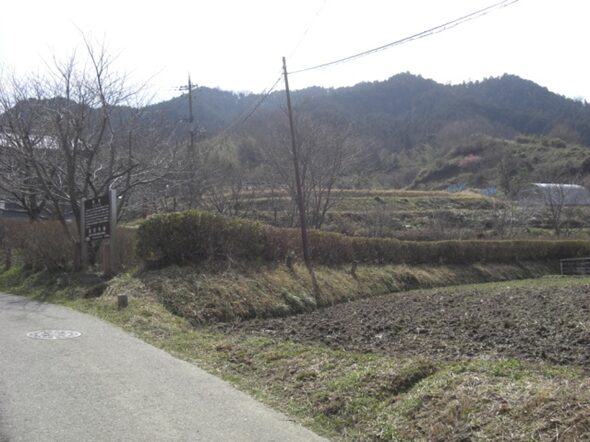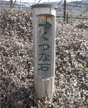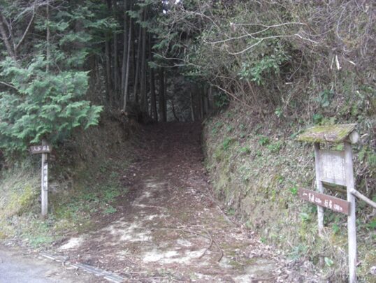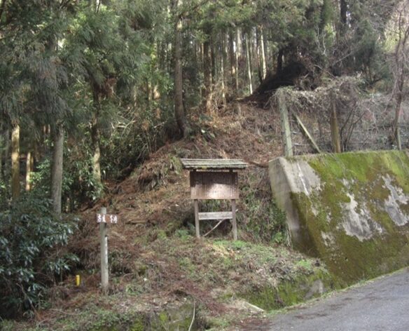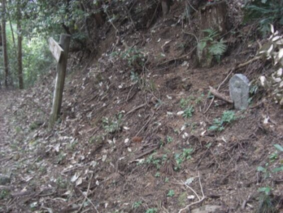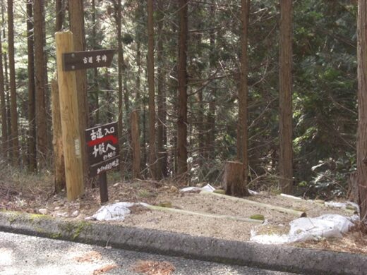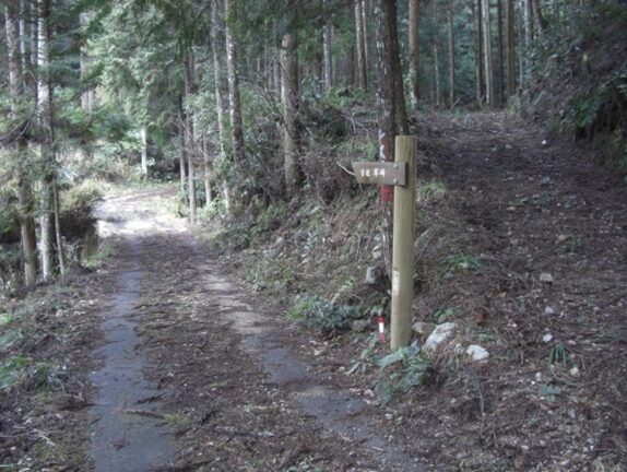 橋をわたり100m程進むと、左に少し山麓に上る道があり入り口に案内標木