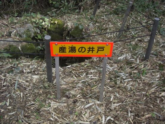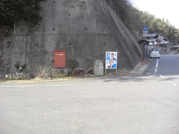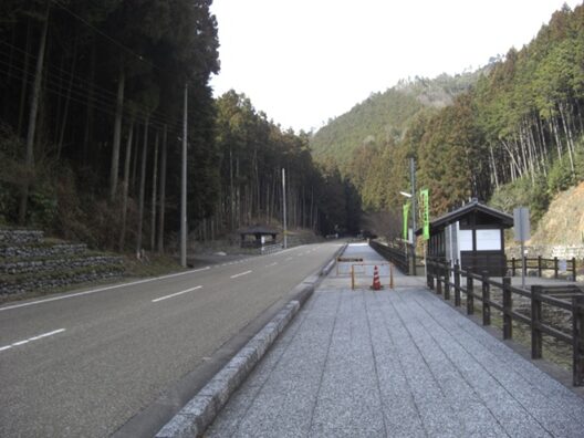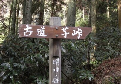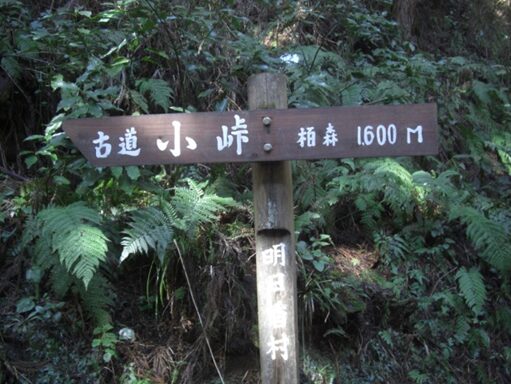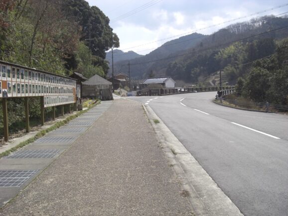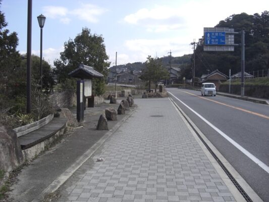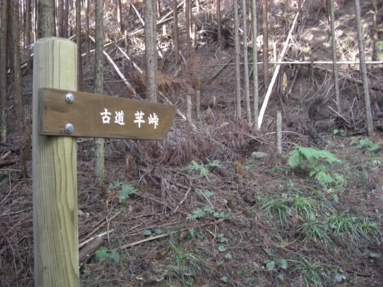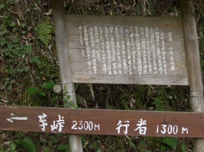 古道の芋峠道を下り新道に出たところ、新道を横断する形で、新道沿いに案内標示があります。