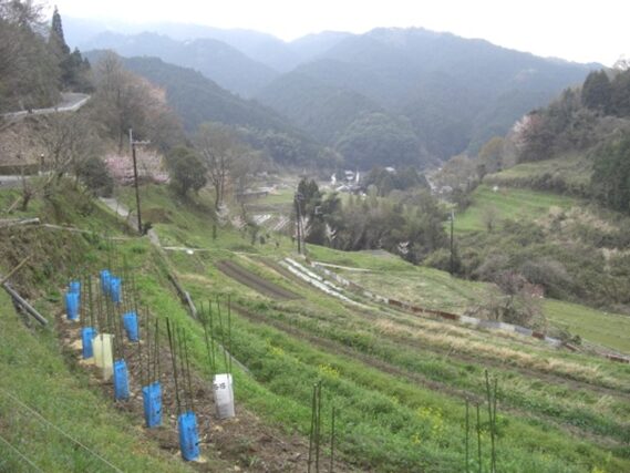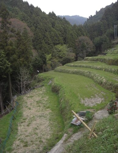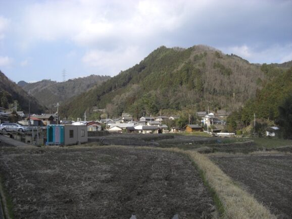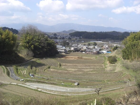 右手飛鳥村の中心地方面の遠景集落の向こう側の小高い林は 甘樫の丘