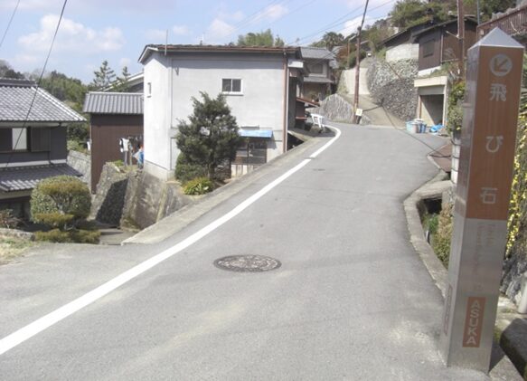 岡街道は奈良と吉野を結ぶ古道で、大和三山の間を縫い、飛鳥川沿いに進んだ後、芋が峠越えで吉野に至る。平城京と飛鳥を結んだ古代の中ッ道の延長にあたる道とされている。生活資材の運搬の道として近世まで重要な道として利用されていた。