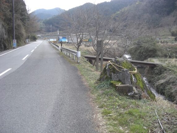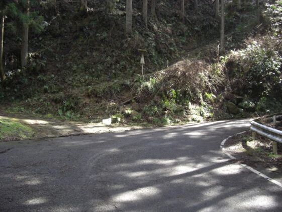 交差点のところの 道標 正面の道が古道と思われる道、交差点に出てきたところ。左が新道交差点に出た右手の石垣際に道標があります。千股の分岐点の辻