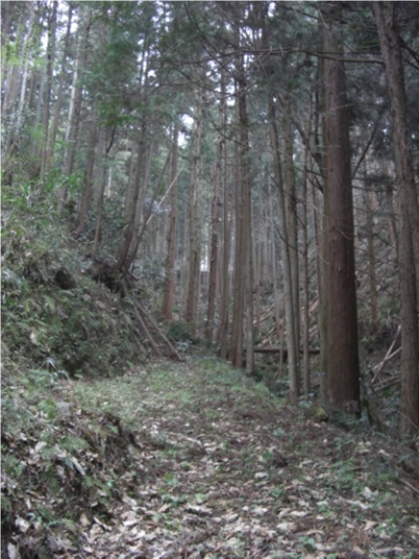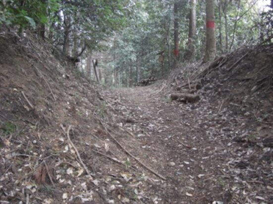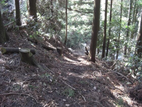 急斜面を下って切り通しの新道に下りる新道と古道の交わる 芋峠をみる かつての旧道の芋峠は改修されている