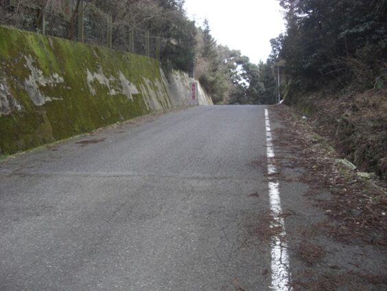 旧道から切り通しになっている新道の峠道までは急斜面を下るところを振り返る