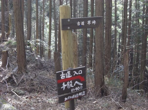 ところが新道を少し下っていくと、右手に古道入り口 千股へ40分と書かれた新しい案内標示が立っていました