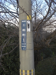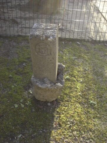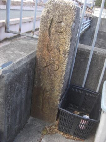 見過ごしたが、右に下っている左の道祖本街道との境の堤に隠れるように 道標 があった。