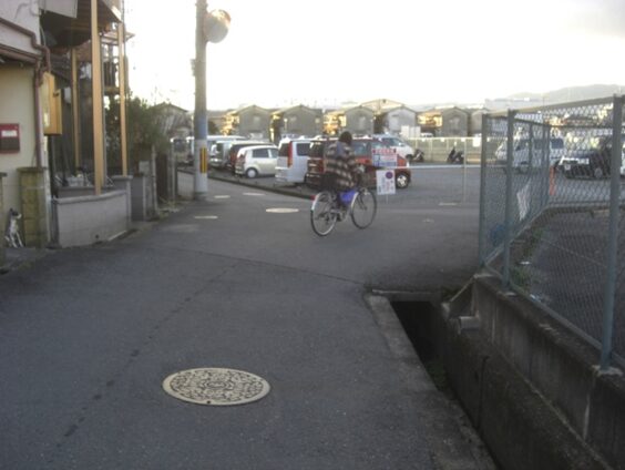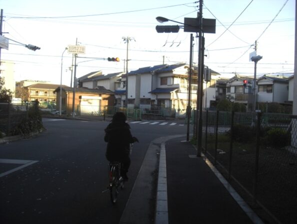 辻を振り返る、自転車の向こう側から歩いてきた