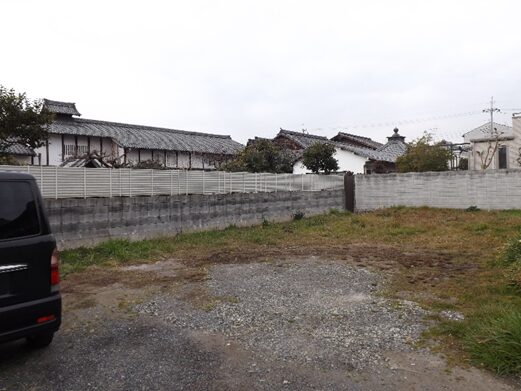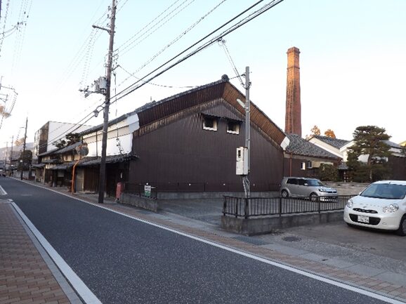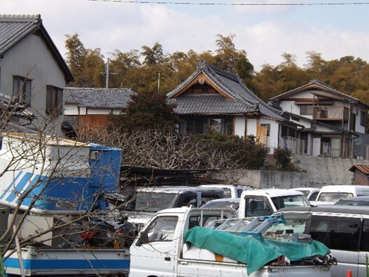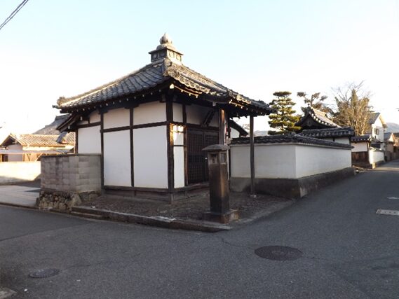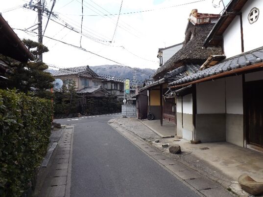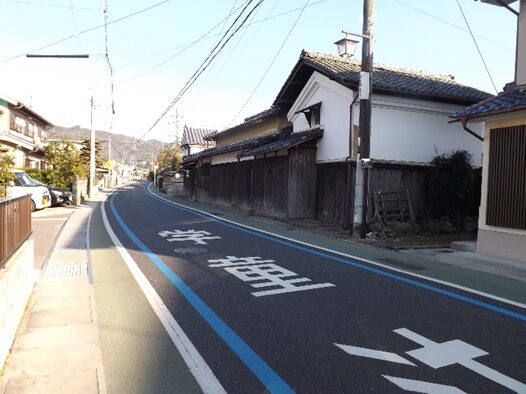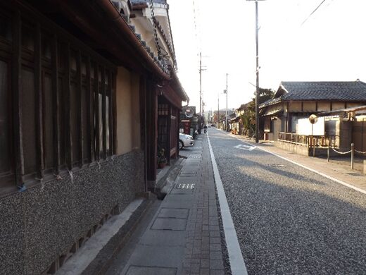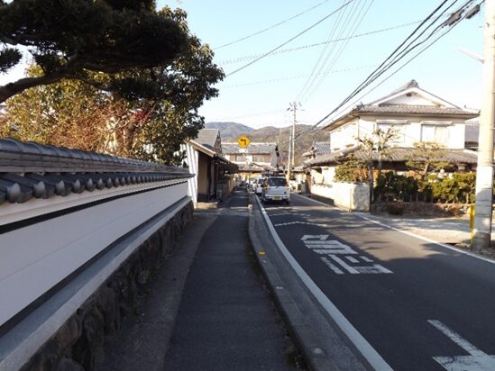 神社のすぐ先から三宅町の街並みを振り返る、藏や虫籠窓のある旧家が並んでいます
