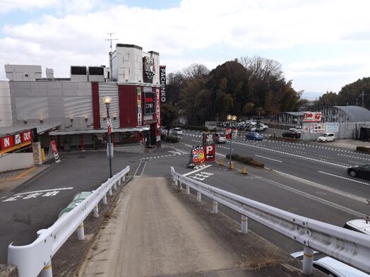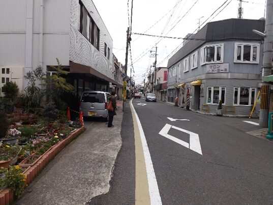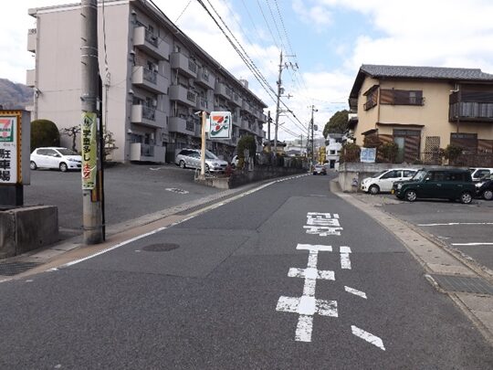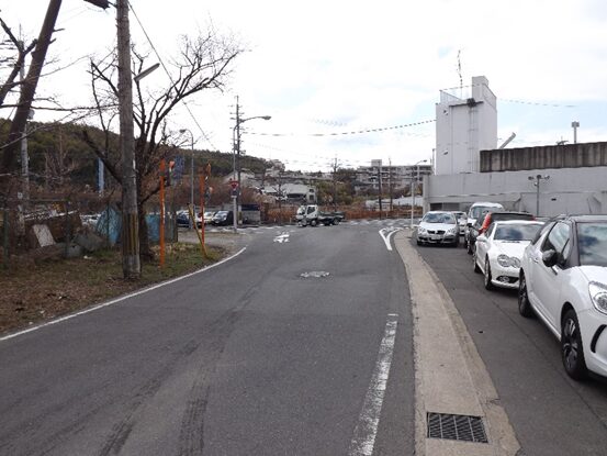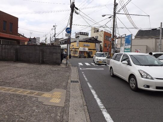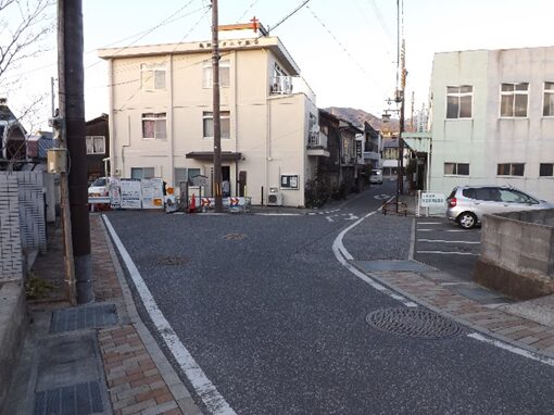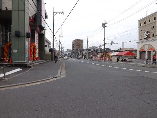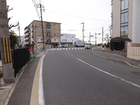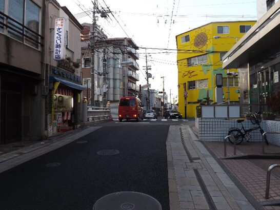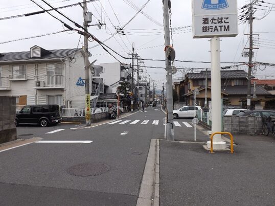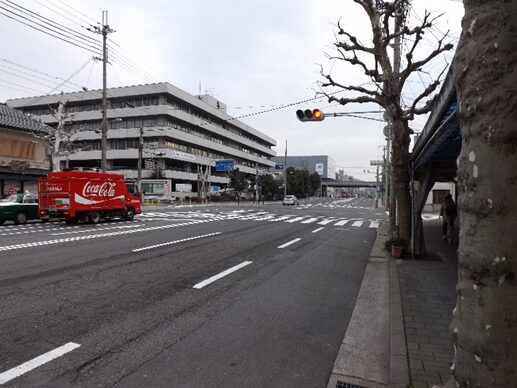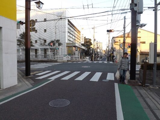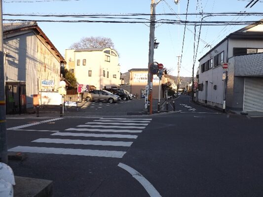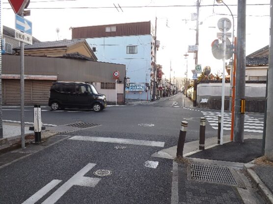 十字路真っ直ぐは柳町通りです。写真は十字路を右に折れるところを振り返ったところです