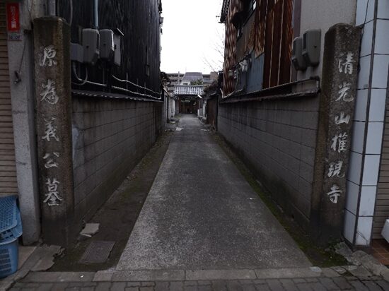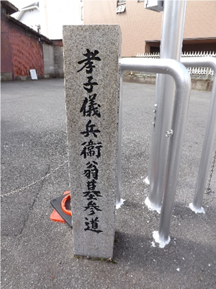 右角に、江戸時代末期の人で親孝行の模範といわれた標柱が立ち「孝子儀兵衛翁の墓 西南七丁」の碑 が立っています。参道を行くと菩提寺冷聲院があります