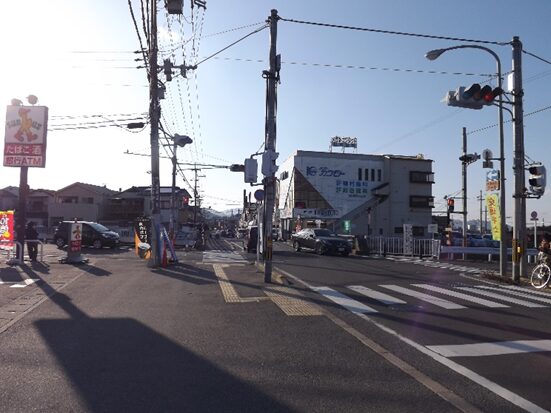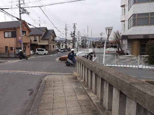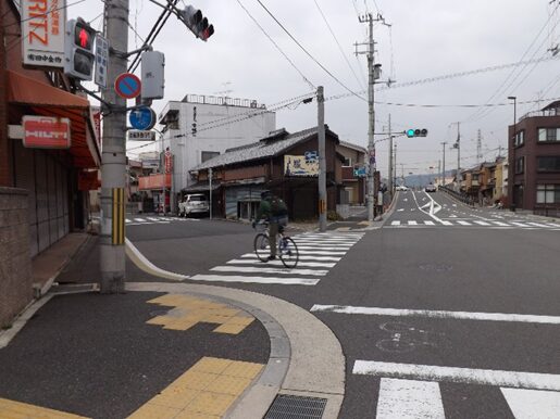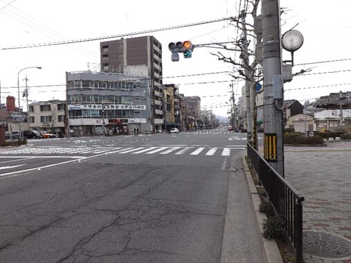 やがて七条通りが終わり、八条通りの桂大橋信号交差点に突き当ります。交差点のT字路を右に折れて