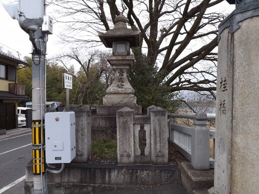 橋を渡った西詰に立つ 大きな常夜灯(弘化三年)もともと桂大橋の南側の舟渡し場跡の岸にあったのがここに移された。基壇には「往来安全」と刻まれている