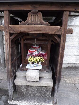 十字路を右に折れる左角に 古世地蔵堂 横町のお地蔵さんと呼ばれ親しまれてきた。平安末期の武将、源頼政の守り本尊と伝わる「矢の根地蔵」が祀られている