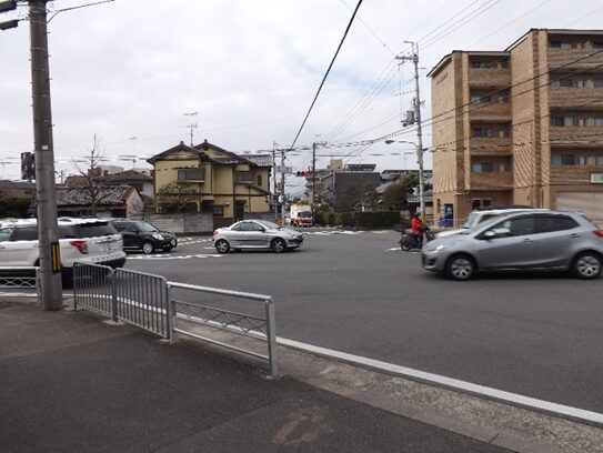 暫く西に七条通りを歩いて一つ目の七条新千本信号交差点のところから振り返ったところです。向かって交差点の左角、赤い車の角は 西鴻臚館跡