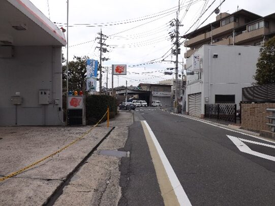 真っ直ぐ進むと、左角にGSがある五差路の信号交差点に出ます。左南へは広い道路で、街道は右斜めに(西)入る狭い道です