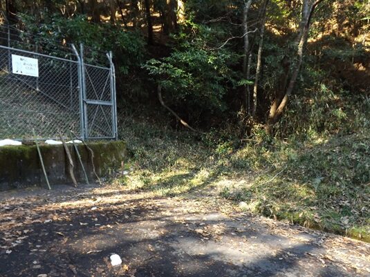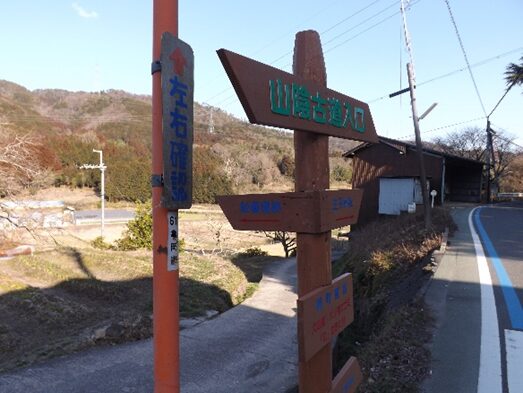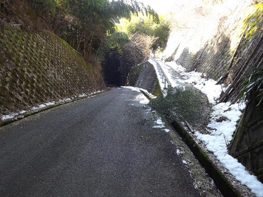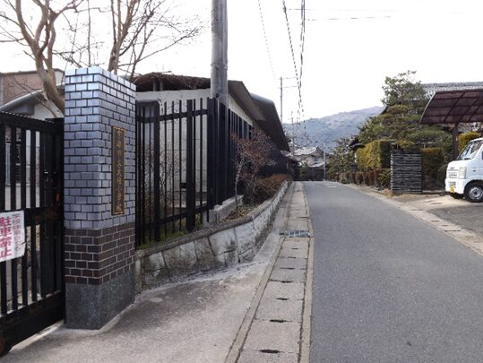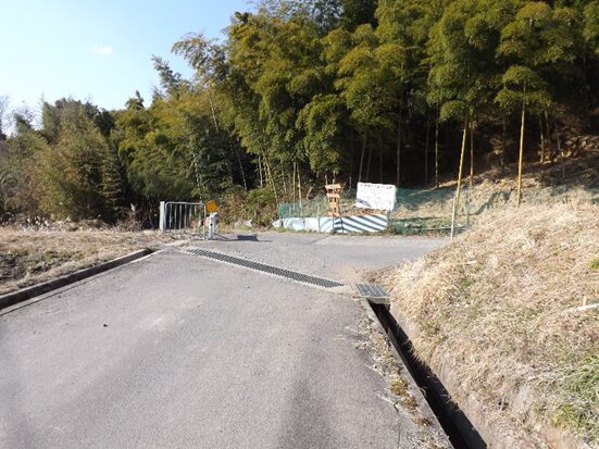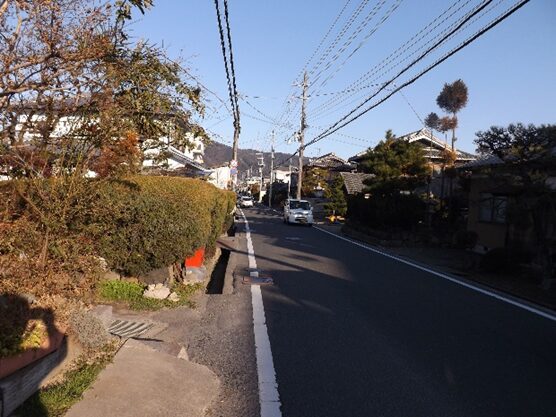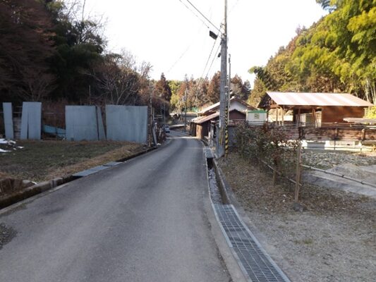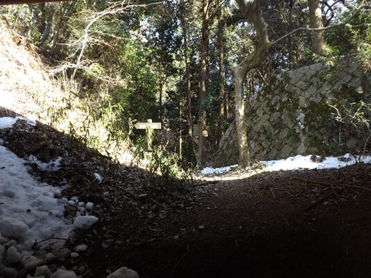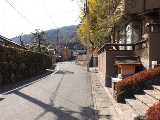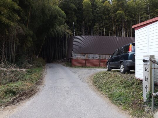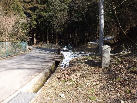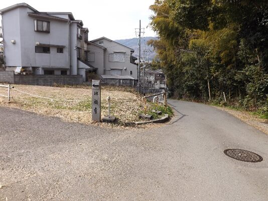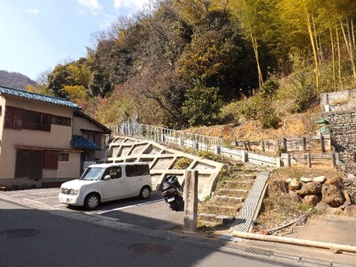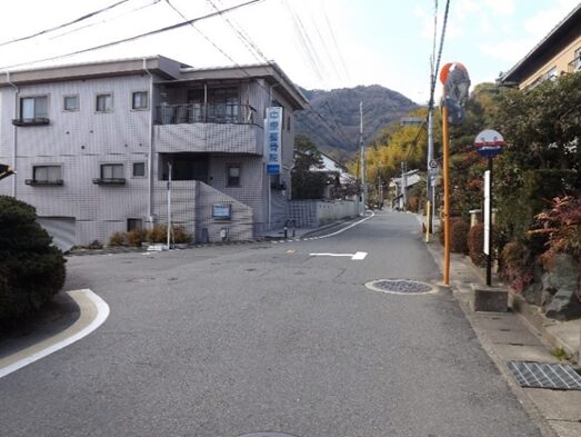 円通寺を西に進む道が穴太口です。円通寺前から90m程先でT字路となり左に折れます