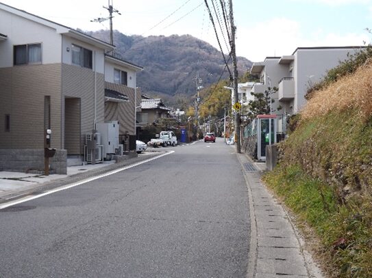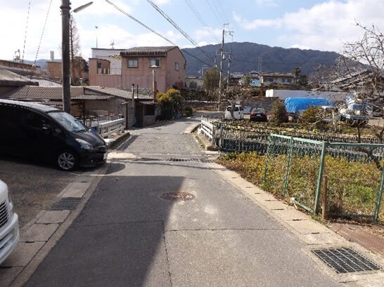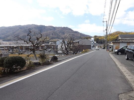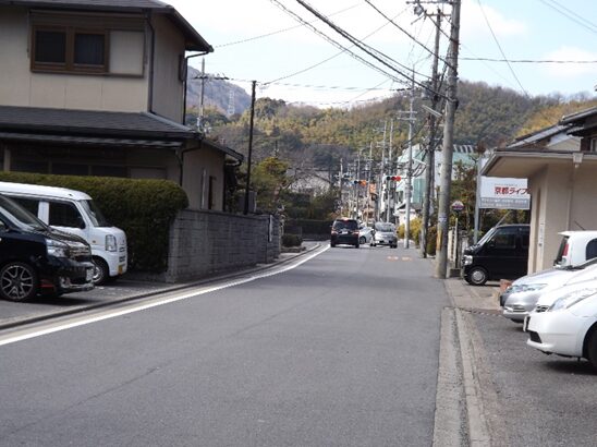 正面の山は、山上の尾根を京都へ歩く、唐櫃越道 です、ビルの奥に見える山は愛宕山で、裏参道 が下ってきています
