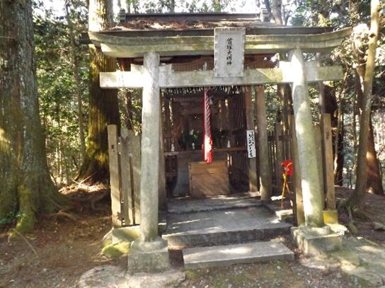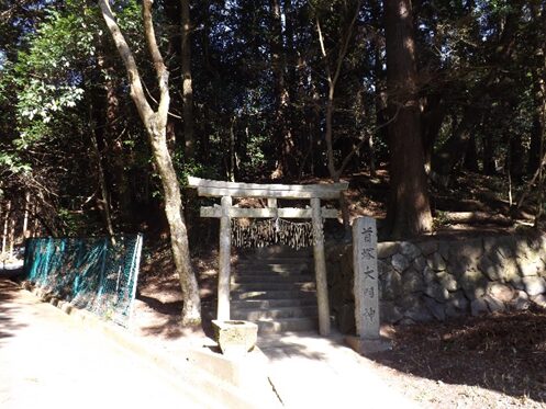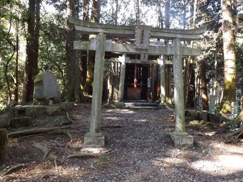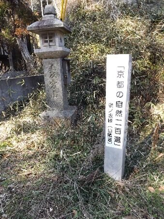 神社の鳥居の傍に立つ、愛宕燈籠「是より左 妙見山ほうき谷越 廿一ばんあな寺」天保四年(1833)の銘で、道標を兼ねている