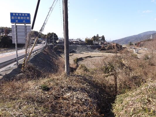 横町通りは右から進んできて、十字路に出たところです、写真は正面右角で 古世門跡、亀山城跡は向かって左へ