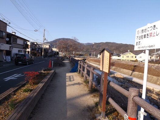 橋より右手方向の景色と橋の西詰に立つ 千本松(野橋立)跡