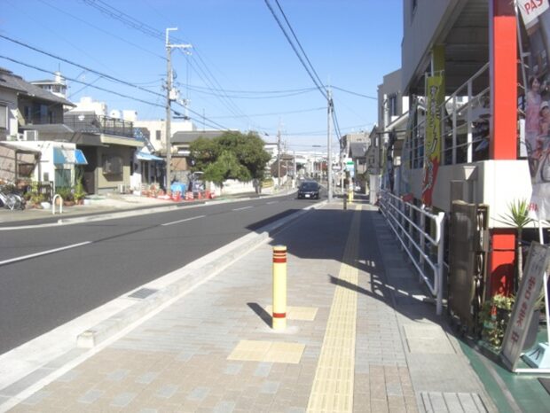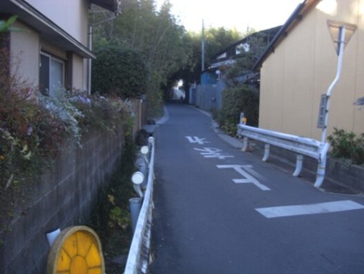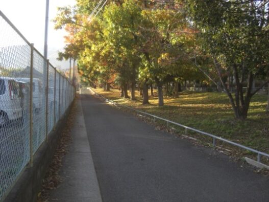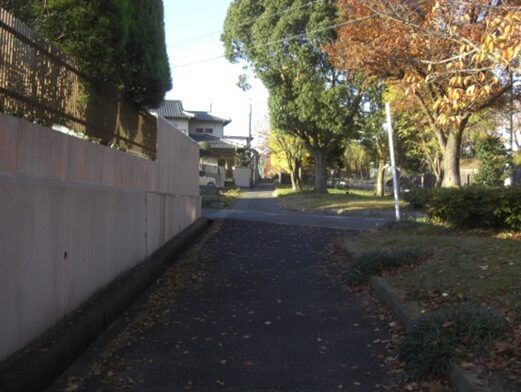 南から西への竹の里本通りの南側の遊歩道のような道を歩く