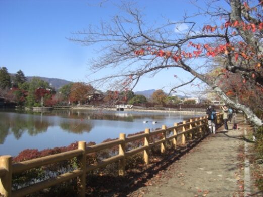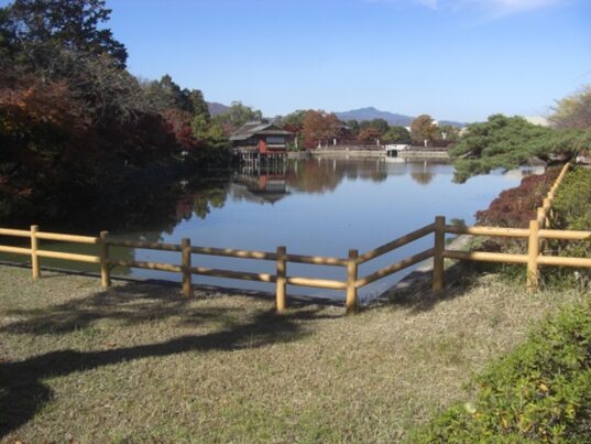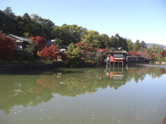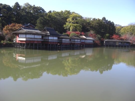 よく時代劇でみた錦水亭の景観が八条池の対岸の池の上に並ぶ