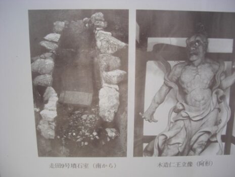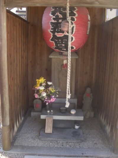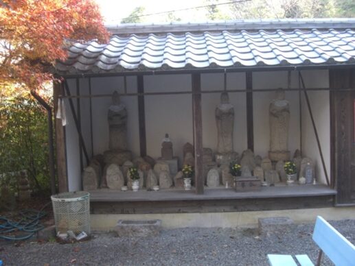 本堂前方西側にある 地蔵石仏の祠 は南北朝期のもの。お堂の裏には海印寺古墳(走田九号)の原形が一部残っている