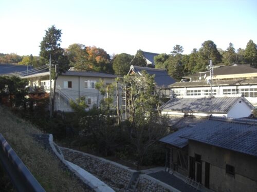 左の坂を上ると西山公園体育館がありそこからの眺望。愛宕、比叡山、東山三十六峰が遠望される