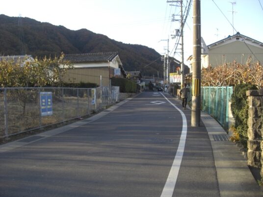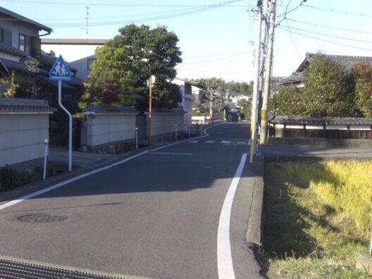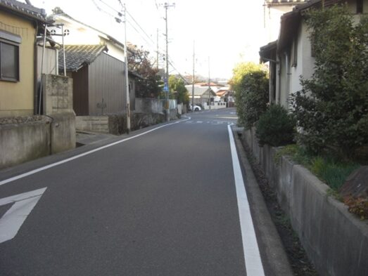 栗生路はこの先、西陣町交差点に出て西北に進路を変え真っ直ぐの道を進む