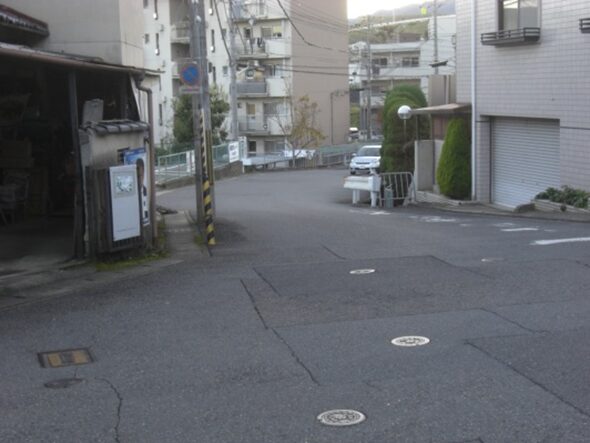 バス停が過ぎたところで道は分岐するので左の道を入る。右にハイアットスクエアーのマンション