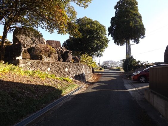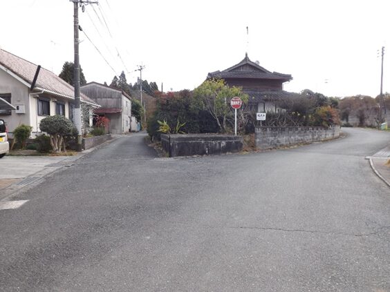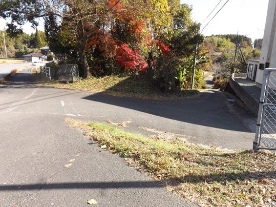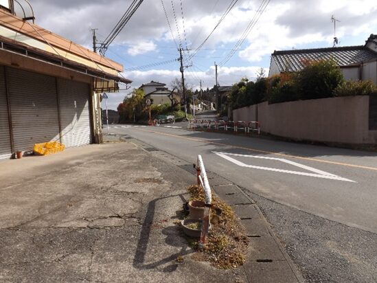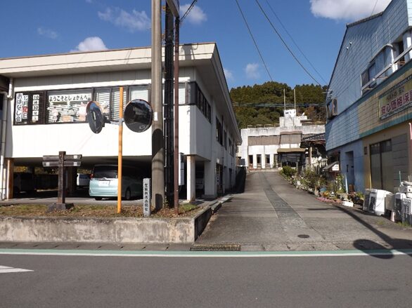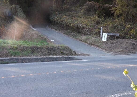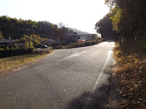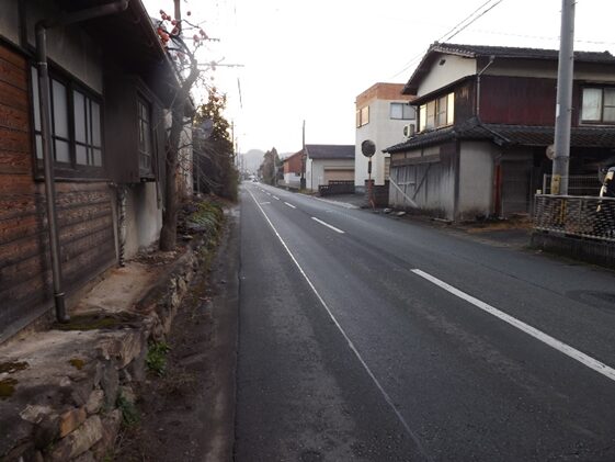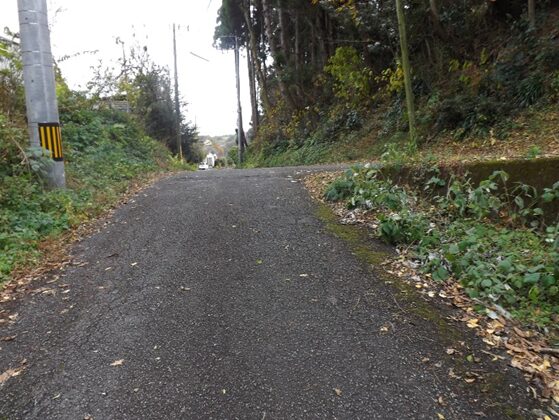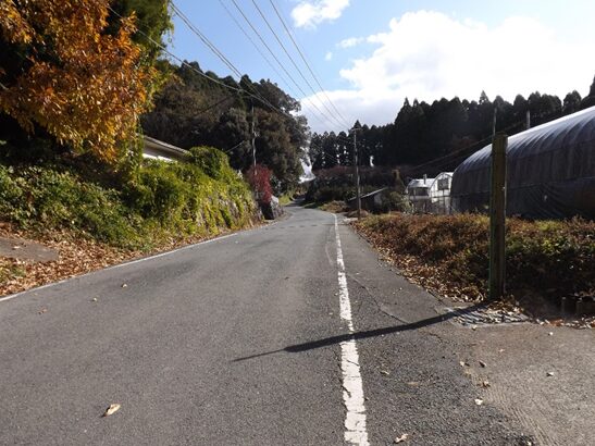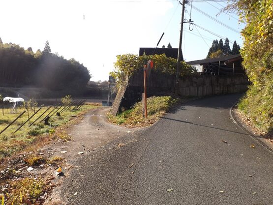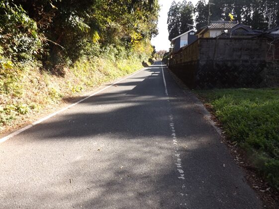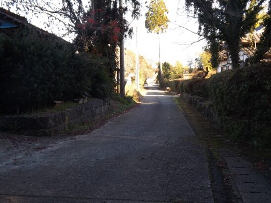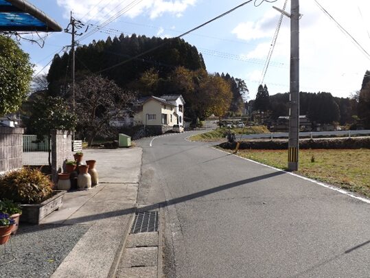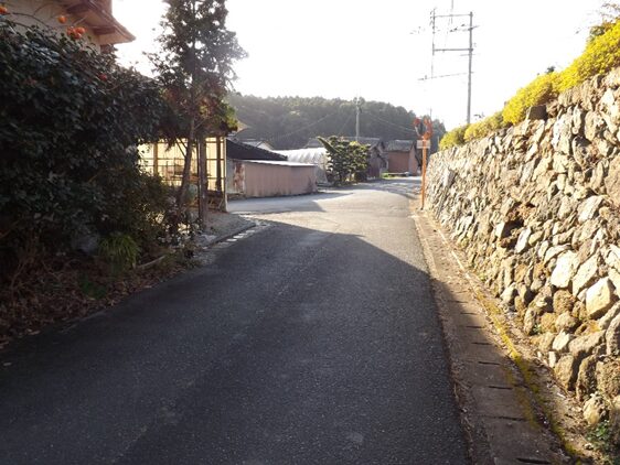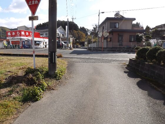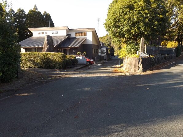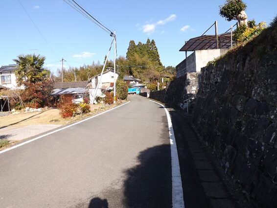 広い道を少し進み振り返る、向かって右から家の側を上ってきた