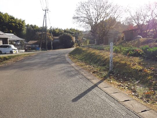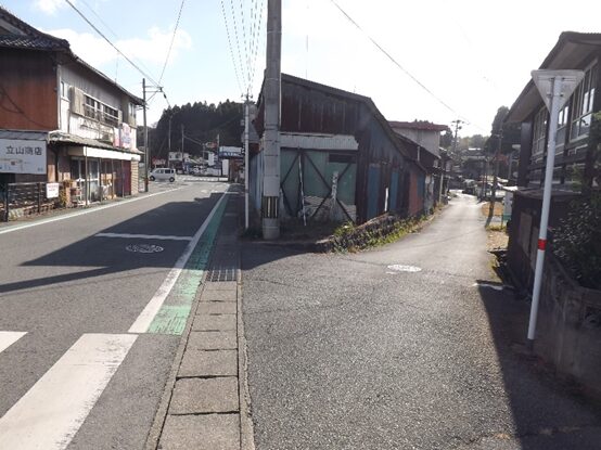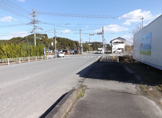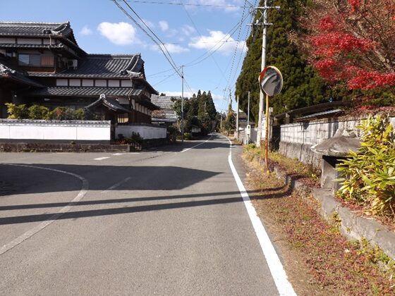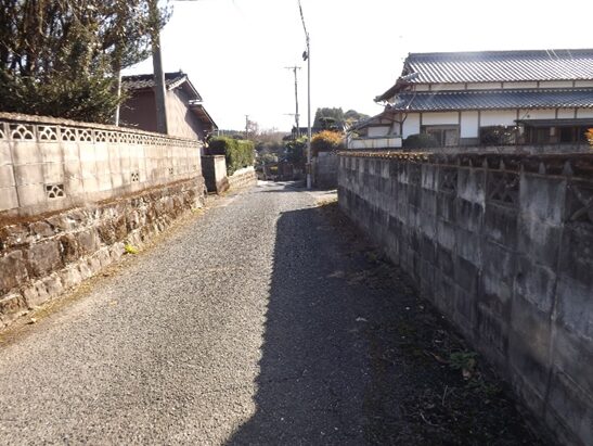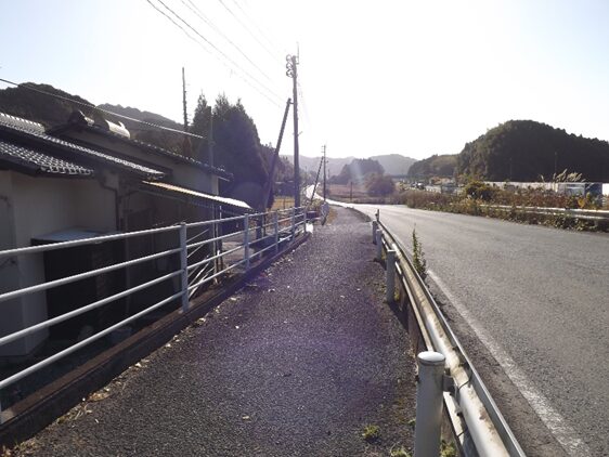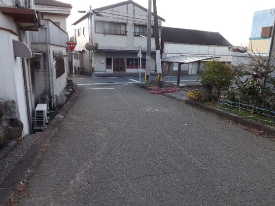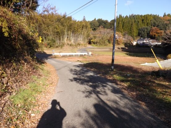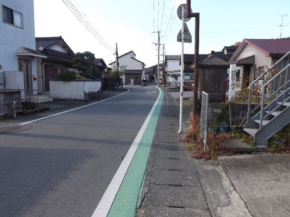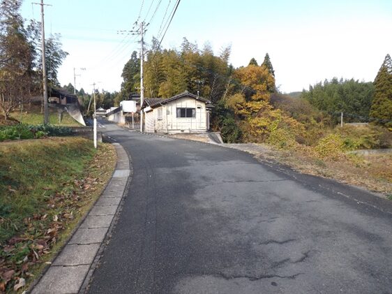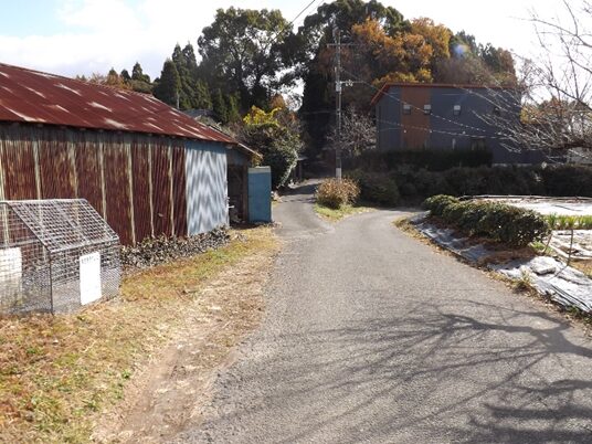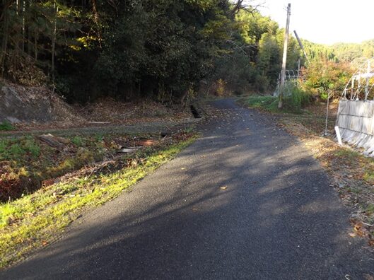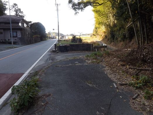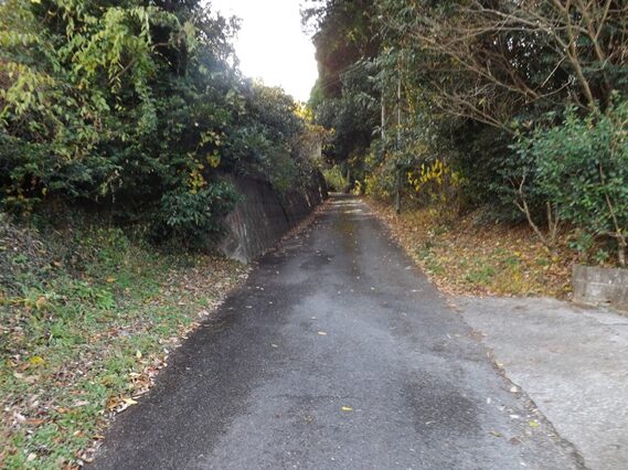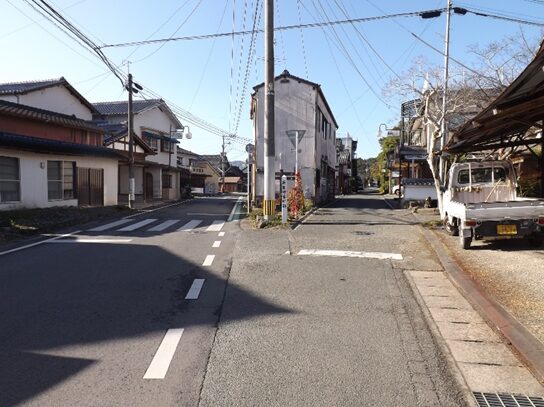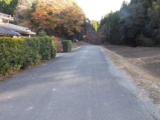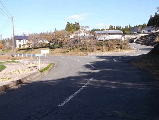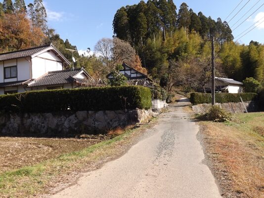 広い道を少し進み振り返る、向かって右から家の側を上ってきた