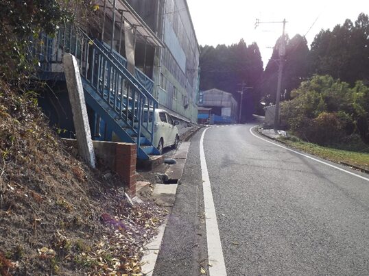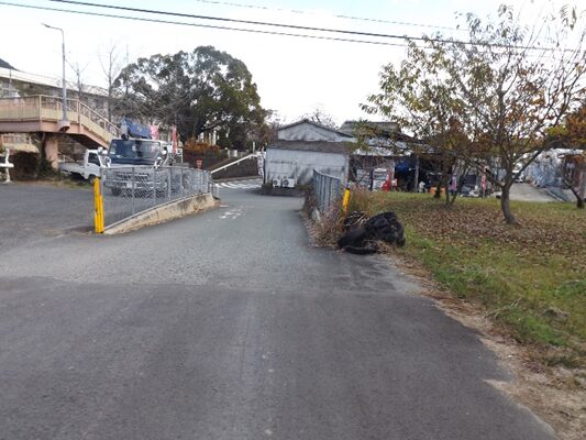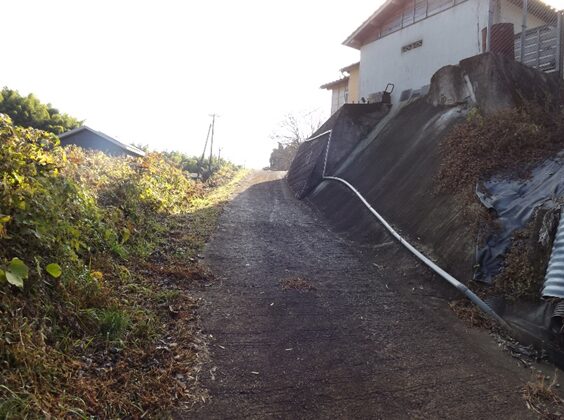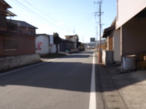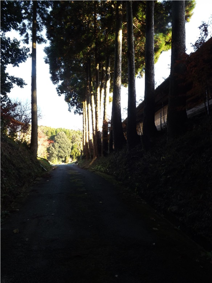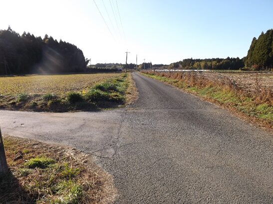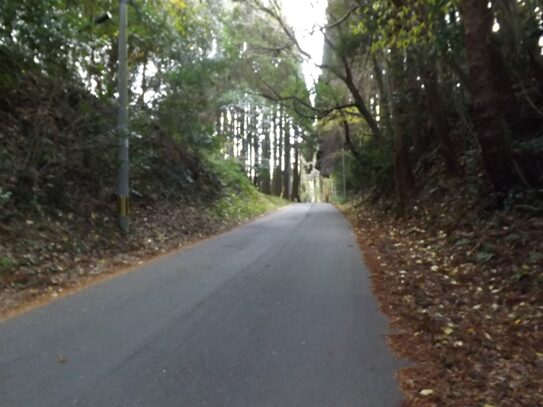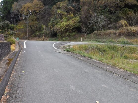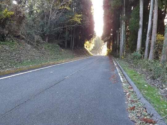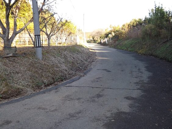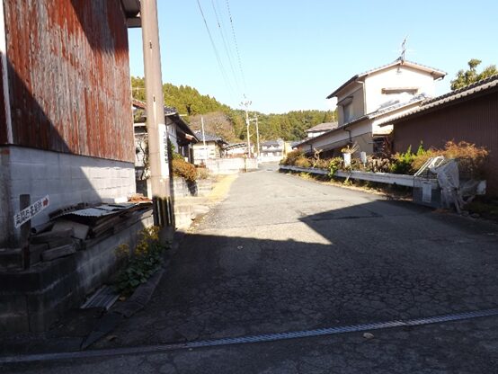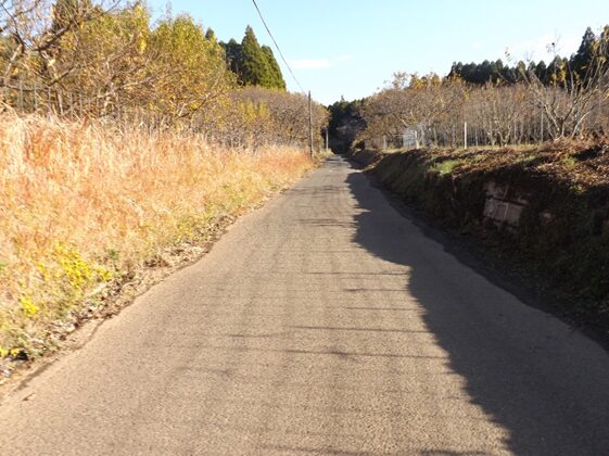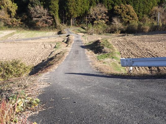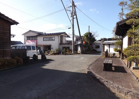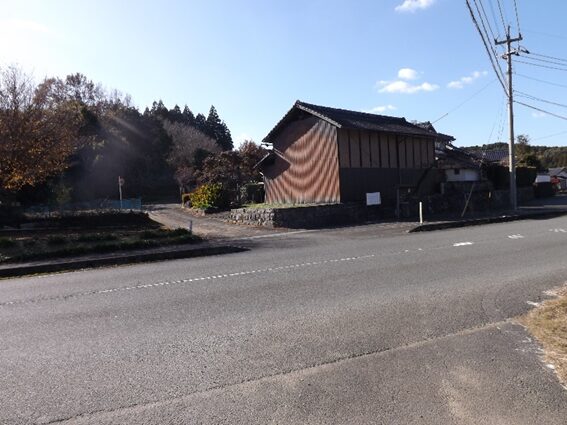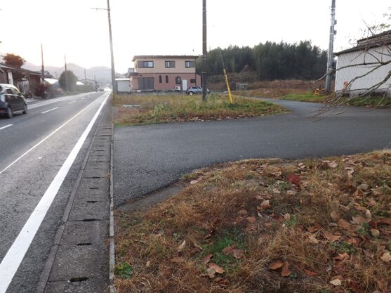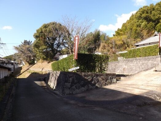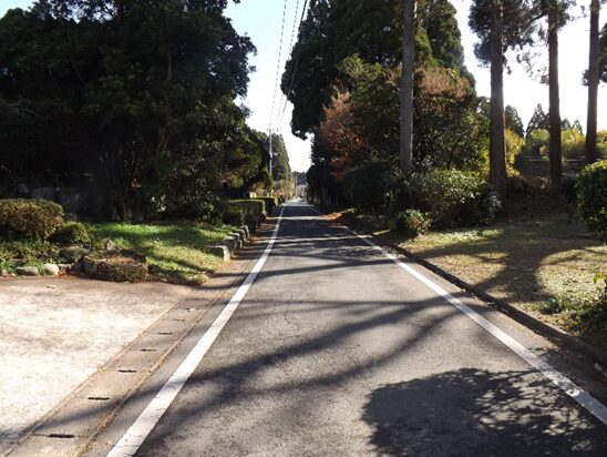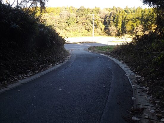 広い道を少し進み振り返る、向かって右から家の側を上ってきた
