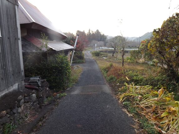正面の自動車道を横切り自動車道を少し進むと左の山裾に民家が見える、その前に上り道が見えます
