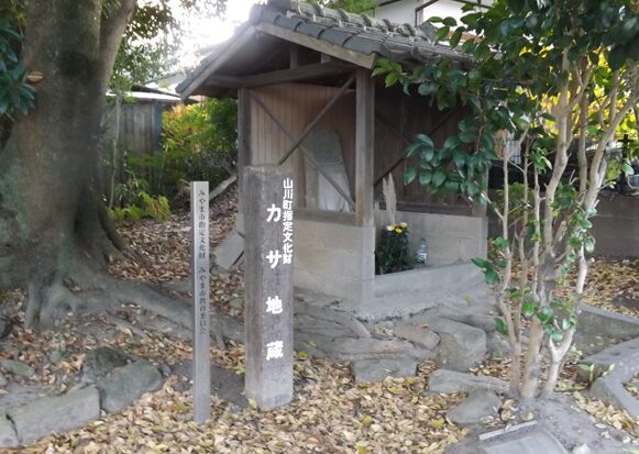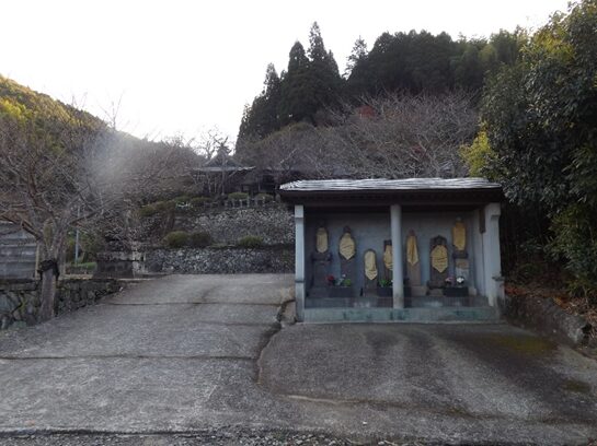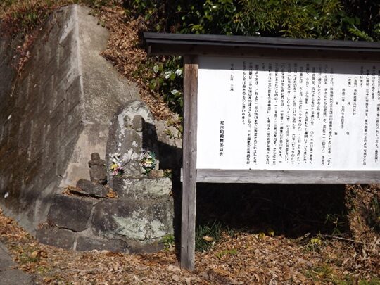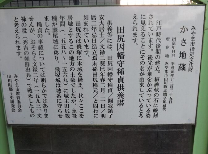その先、左手三峯バス停の先に かさ地蔵と田尻因幡守種貞の供養塔