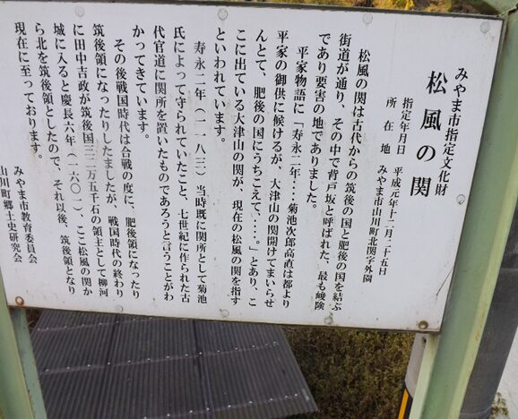 松風の関跡の案内板 寿永二年(1183)にはすでに関があったと書かれている。7世紀の古代官道に設けられていた