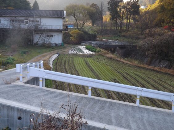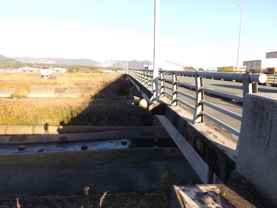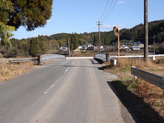 下って右にカーブ飯江川(はえがわ)に架かる井出の元橋を渡って左へ川に沿う