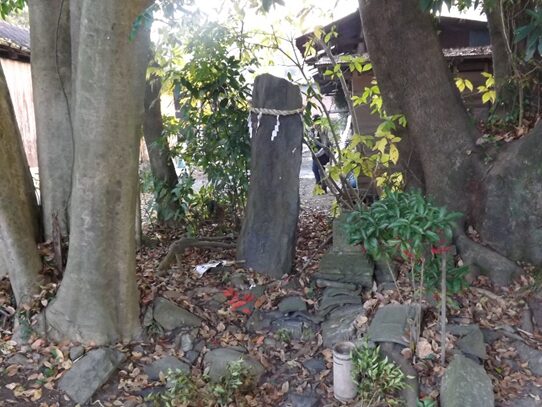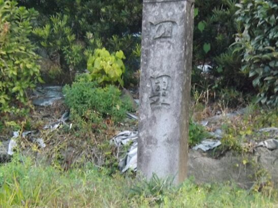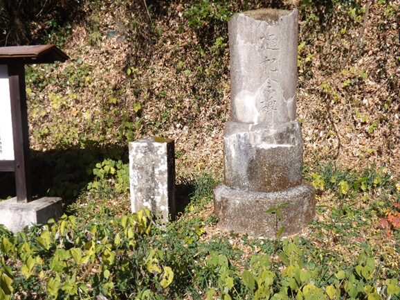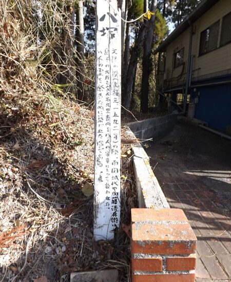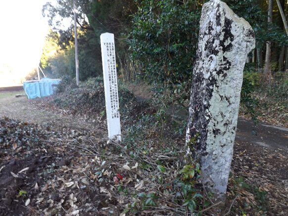 石塔の傍の木の際に 豊前街道十里木跡の標柱